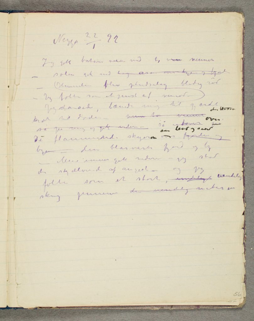 Munch’s many journals, notebooks, letters and other writing can be viewed online at eMunch.no, a quite incredible project by the Munch Museum. This particular entry can be found in The Violet Journal; translation courtesy of Francesca M. Nichols. Image and text used here by kind permission of the Munch Museum.