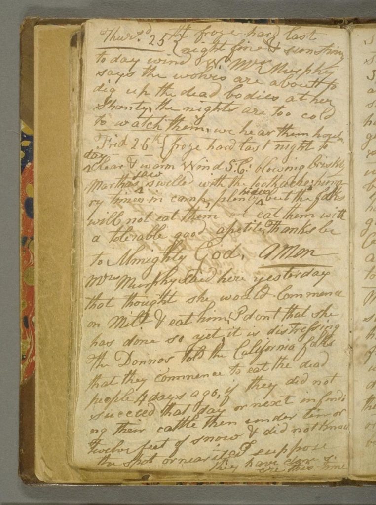 Frid 26th froze hard last night to day clear & warm Wind S: E: blowing briskly Marthas jaw swelled with the toothache: hungry times in camp, plenty hides but the folks will not eat them we eat them with a tolerable good apetite. Thanks be to Almighty God. Amen Mrs Murphy said here yesterday that thought she would Commence on Milt. & eat him. I dont that she has done so yet, it is distressing. The Donnos told the California folks that they commence to eat the dead people 4 days ago, if they did not succeed that day or next in finding their cattle then under ten or twelve feet of snow & did not know the spot or near it, I suppose they have done so ere this time