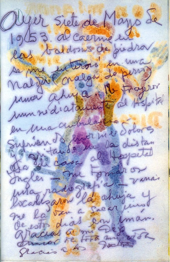 Yesterday, the seventh of May 1953 as I fell on the flagstones I got a needle stuck in my ass (dog’s ass). They brought me immediately to the hospital in an ambulance – Suffering awful pains and screaming all the way from home to the British Hospital – they took an X ray – several and located the needle and they are going to take it out one of these days with a magnet. Thanks to my Diego the love of my life thanks to the Doctors
