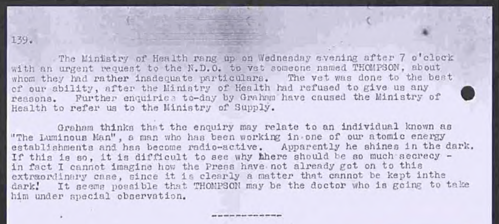 Graham thinks that the enquiry may relate to an individual known as ‘The Luminous Man’, a man who has been working in one of our atomic energy establishments and has become radioactive. Apparently he shines in the dark. If this is so, it is difficult to see why there should be so much secrecy – in fact I cannot imagine how the Press have not already got on to this extraordinary case, since it is clearly a matter that cannot be kept in the dark! It seems possible that THOMPSON may be the doctor who is going to take him under special observation.