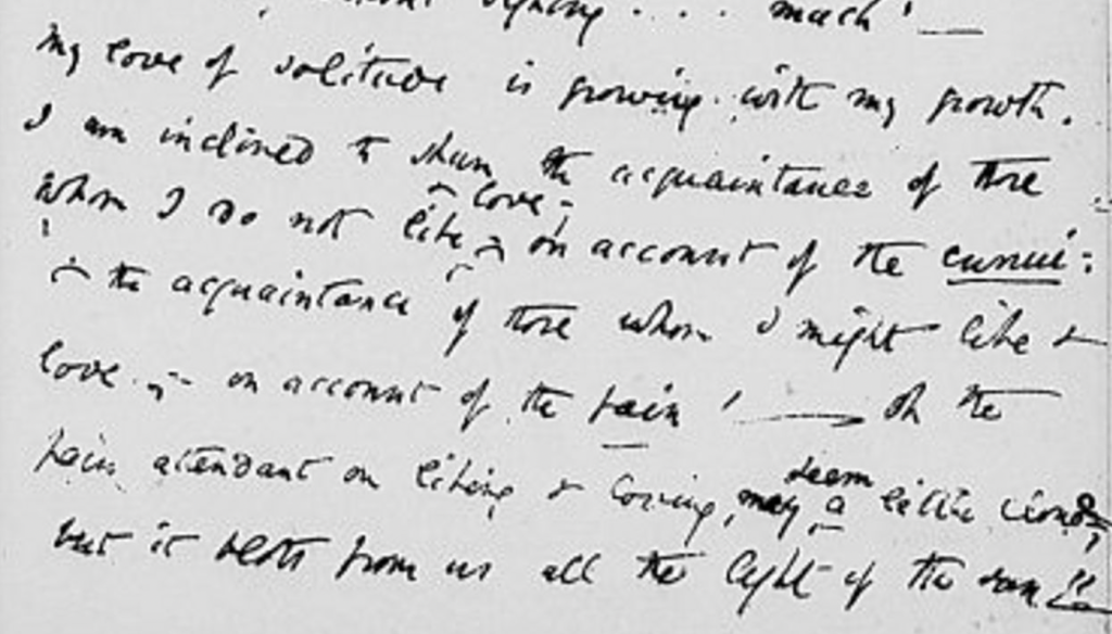 My love of solitude is growing with my growth. I am inclined to shun the acquaintance of those whom I do not like & love; on account of the ennui: & the acquaintance of those whom I might like & love,—on account of the pain!—Oh the pain attendant on liking & loving, may seem a little cloud,—but it blots from us all the light of the sun!!