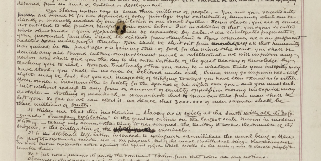 It strikes me that this institution—slavery as it exists at the South with all its “safe-guards” and “necessary legislation”—is the greatest crime on the largest scale known in modern history; taking into account the time it has occupied, the territory it covers, the number of its subjects, and the civilization of the criminals. It is deliberate legislation intended to extinguish and annihilate the moral being of men for profit; systematic murder, not of the physical, but of the moral and intellectual being; blasphemy, not in word, but in systematic action against the Spirit of God which dwells in the souls of men to elevate, purify, and ennoble them. So I feel now; perhaps it’s partly the dominant election furor that colors my notions. Of course, slaveholders are infinitely better than their system. And we have nothing to say about this system where it is established, and we have no right to interfere with it, no responsibility for it. The question for the North is whether we shall help establish it elsewhere, in the “territories” our nation owns.