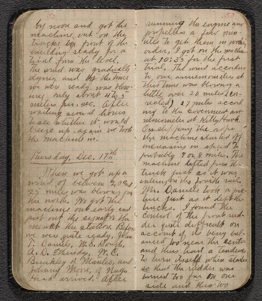 When we got up a wind of between 20 and 25 miles was blowing from the north. We got the machine out early and put out signal for the men at the station. Before we were quite ready John T. Daniels, W.S. Dough, A. D. Esteridge, W.C. Brinkley of Manteo and Johnny Moore of Nag’s Head arrived. After running the engine and propellors a few minutes to get them in working order, I got on the machine at 10:35 for the first trial. The wind, according to our anemometers at this time, was blowing a little over 20 miles (corrected) 27 miles according to the Government anemometer at Kitty Hawk. On slipping the rope the machine started off increasing in speed to probably 7 or 8 miles. The machine lifted from the truck just as it was entering on the fourth rail. Mr. Daniels took a picture just as it left the tracks. I found the control of the front rudder quite difficult on account of its being balanced too near the center and thus had a tendency to turn itself when stated so that the rudder was turned too far on one side and then too far on the other. As a result the machine would rise suddenly to about 10 ft. and then as suddenly, on turning the rudder, dart for the ground. A sudden dart when out about 100 feet from the end of the tracks ended the flight. Time about 12 seconds (not know exactly as watch was not promptly stopped). The lever for throwing off the engine was broken, and the skid under the rudder cracked. After repairs, at 20 min. after 11 o’clock Will made the second trial. The course was about like mine, up and down but a little longer over the ground though about the same time. Dist. not measured but about 175 ft. Wind speed not quite so strong. With the aid of the station men present, we picked the machine up and carried it back to the starting ways. At about 20 minutes till 12 o’clock I made the third trial. When out about the same distance as Will’s, I met with a strong gust from the left which raised the left wing and sidled the machine off to the right in a lively manner. I immediately turned the rudder to bring the machine down and then worked the end control. Much to our surprise, on reaching the ground the left wing struck first, showing the lateral control of this machine much more effective than on any of our former ones. At the time of its sidling it raised 12 to 14 feet. At just 12 o’clock Will started on the fourth and last trip. The machine started off with its ups and downs as as it had before, but by the time he had gone over three or four hundred feet he had it under much better control, and was traveling on a fairly even course it proceeded in this manner till it reached a small hummock out about 800 feet from the starting ways, when it began its pitching again and suddenly darted into the ground. The front rudder frame was badly broken up, but the main frame scuffed none at all. The distance over the ground was 852 feet in 59 seconds. The engine turns was 1071, but this included several seconds while on the staring ways and probably about a half second after landing. The jar of landing had set the watch on machine back so that we have no exact record for the 1071 turns. Will took a picture of my third flight just before the gust struck the machine. The machine left the ways successfully at every trial, and the tail was never caught by the truck as we had feared.